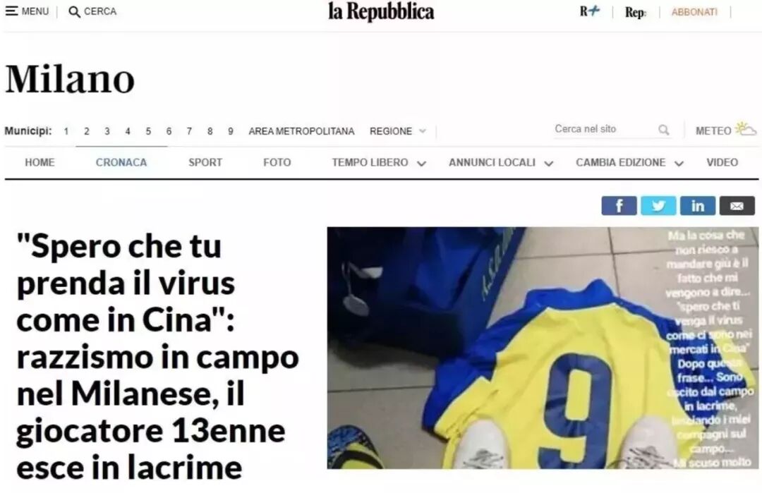 部分意大利人已把新型冠状病毒变成了对华人言语侮辱的“新词汇”,据1月27日意大利《共和国报》的报道,米兰一名13岁华人男孩Lin在一场球赛里遭到对方球员的侮辱:“希望你也像在中国染上传染病(的中国人)一样。”更糟的是对方球队教练、经理都没有上前制止,而主裁判在当时更是没有任何反应。被恶意伤害的Lin只能流着眼泪离开了赛场,退出了比赛。
