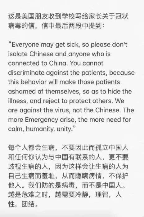 美国学校给家长的信中说得很好:“每个人都会生病,不要因此而孤立中国人和你认为与中国有联系的人,更不要歧视生病的人,因为这样会让生病的人为自己生病而羞耻,从而隐瞒病情,不保护他人。我们防的是病毒,而不是中国人。越是危难之时,越需要冷静,理智,人性,团结。”