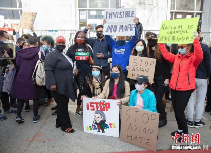 当地时间3月22日,美国加州旧金山民众在司法大楼前集会反对歧视亚洲族裔。近期,美国不断发生针对亚裔的歧视与仇恨犯罪事件,多地爆发反对仇视亚裔的游行集会活动。 中新社记者 刘关关 摄