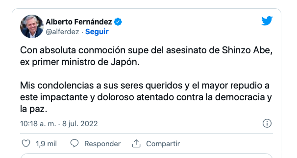 当地时间7月8日上午,费尔南德斯通过推特发文表示:“闻悉日本前首相安倍晋三被刺身亡,深感震惊。在此我向其亲人表达哀悼,并对这一令人震惊和悲痛的对抗民主与和平的袭击予以强烈谴责!”