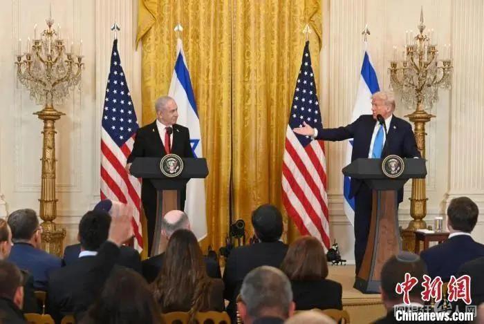 当地时间2月4日,美国总统特朗普与以色列总理内塔尼亚胡在白宫举行记者会。中新社记者 陈孟统 摄