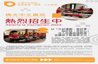 阿根廷佛光中文书苑创立于2009年,秉持佛光山开山宗长·星雾大师「以教育培善人才|之理念办壆,特别着重孩子的品德与价值观之培养,在快乐学中文的环境中,使学童认识中华文化之美的同时,也养成其良好品德,成为「做好事、说好话、存好心」的三好少年与儿童。 我们有优雅整洁的环境,充满爱心的老师,丰富多样的课程,营养美味的午餐,欢迎您和我们一起来开启孩子们学习中文的大门。